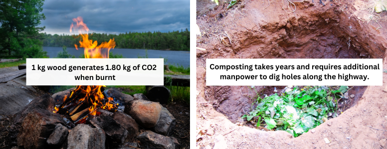 A significant challenge faced by most highways is the treatment of green waste generated along their routes. Allocating a designated area for this purpose is impractical due to the need for supervision, manpower, safety measures, and a dedicated person to oversee the entire process. Consequently, many opt for less sustainable methods, such as burning the waste or using pit hole systems for composting.