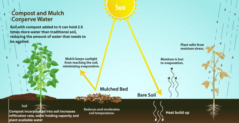 Applying compost to the soil will gradually reduce the amount of water needed for plants. Soil with compost added to it can hold 2.5 times more water than traditional soil, reducing the amount of water that needs to be applied. Compost offers the following benefits.